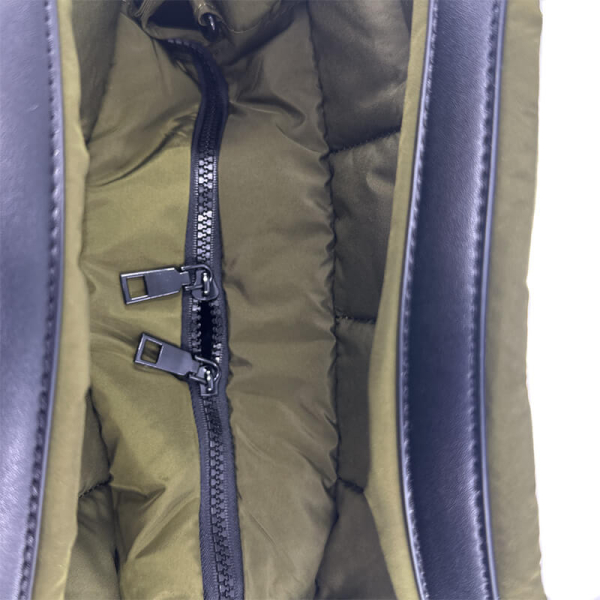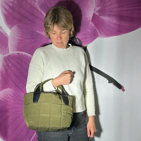 Kaki-Farbe verleiht der Tasche einen zeitlosen,