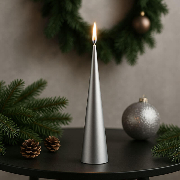 Die 25 cm hohe Kegelkerze in metallic silber von