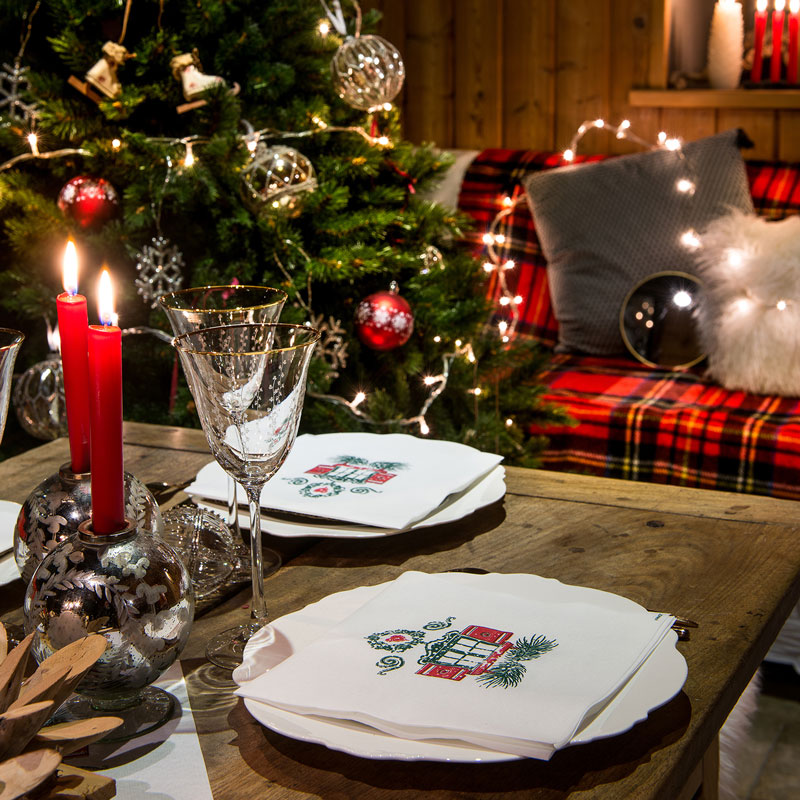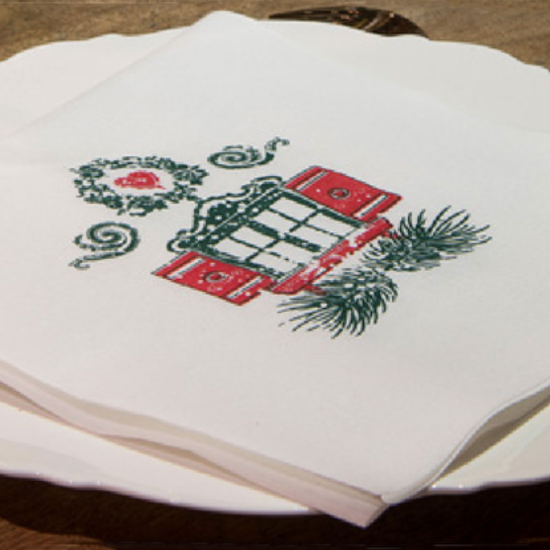 Zauberhafte weiße Vliesserviete 25x25 cm bringt Bergathmospähre auf Ihren Tisch. Bedruckt mit dem traditionellen Chalet aus Tirol in rot und grün Für Ihre Tischdeko ein stylishes Accessoire